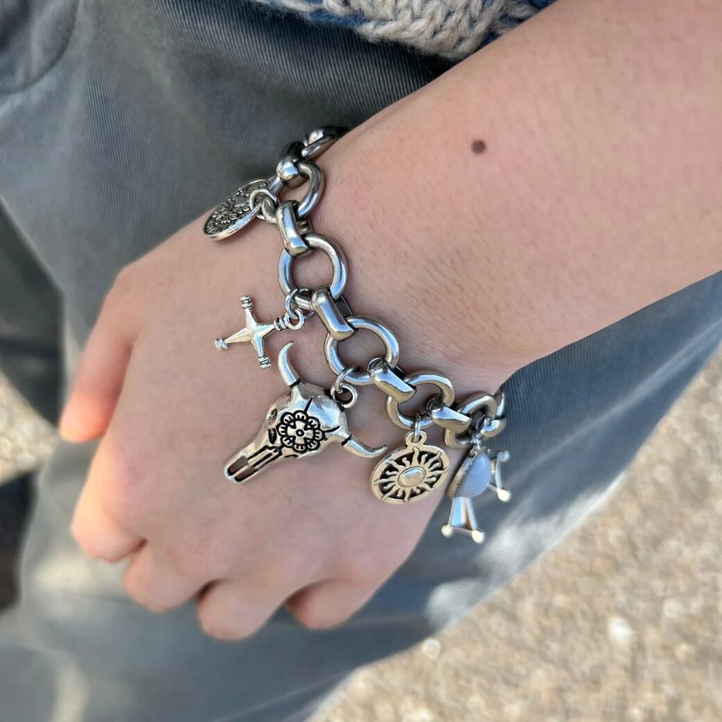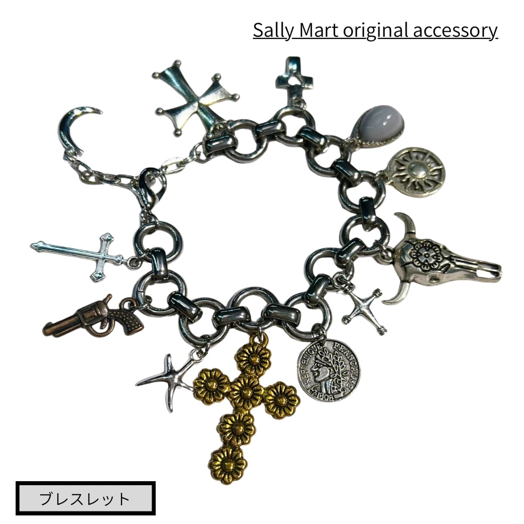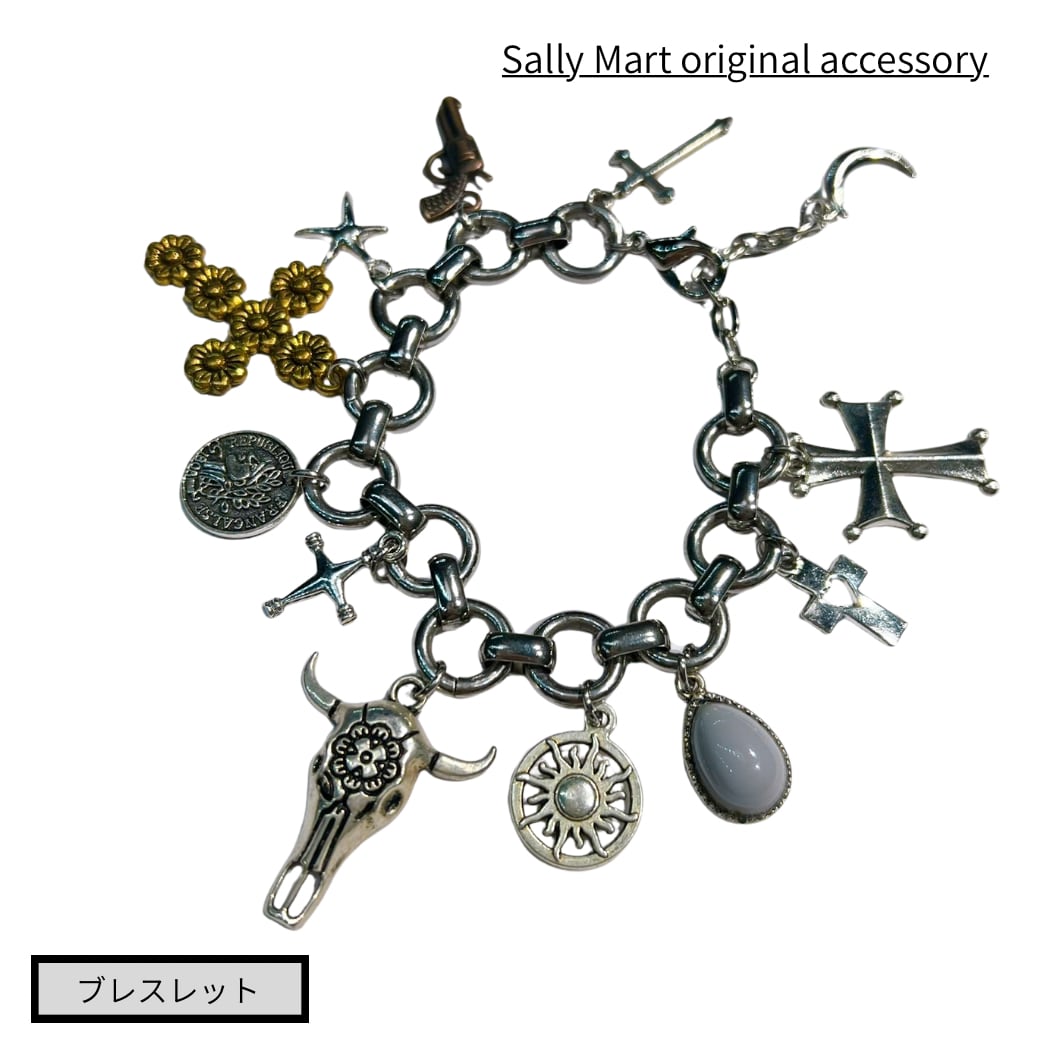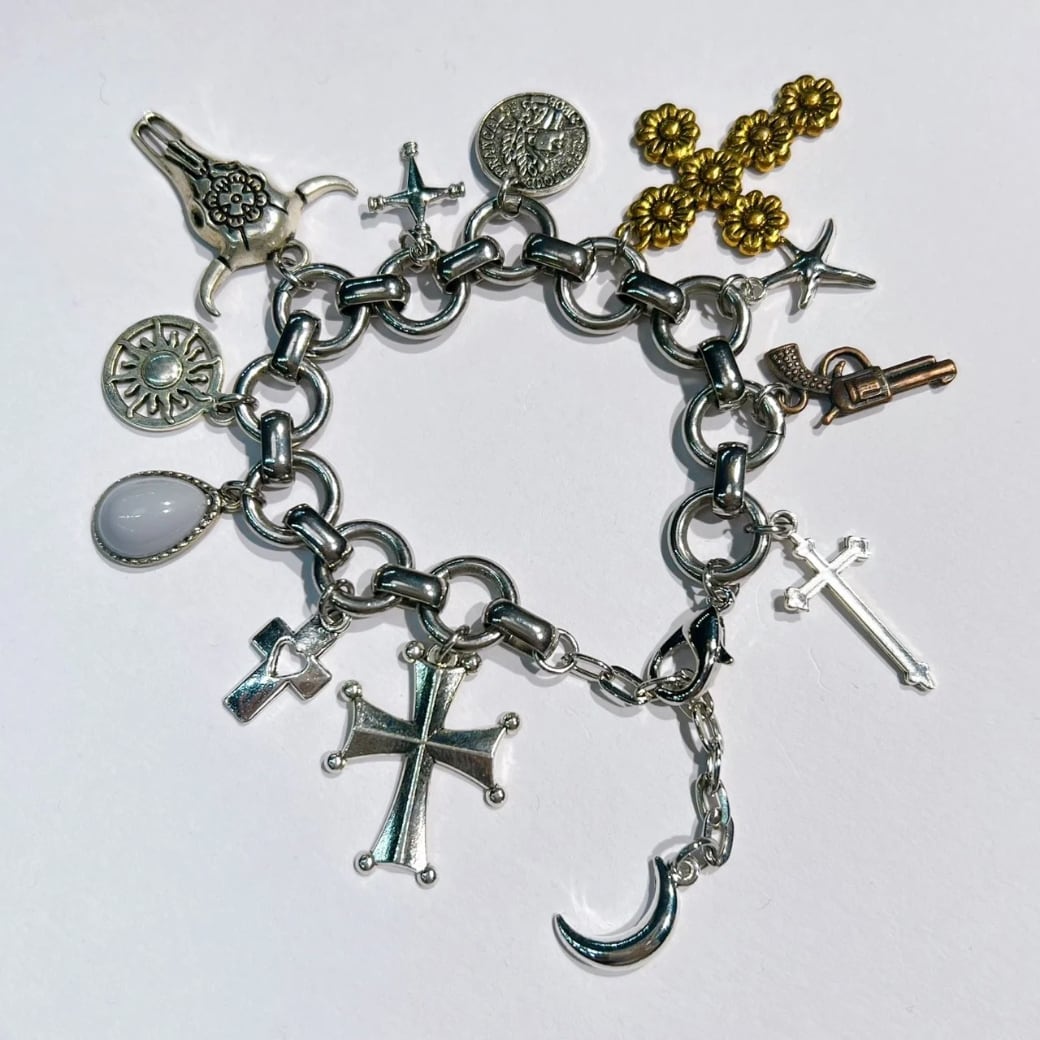 シルバーチェーンにチャームを大量につけたインパクト大のブレスレットです。